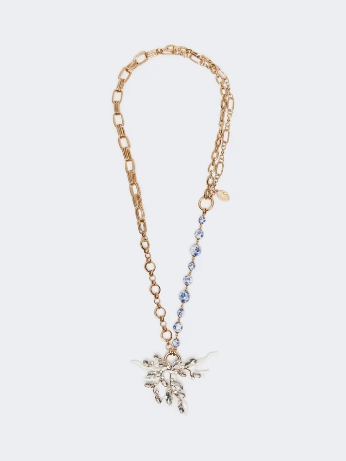 long necklace consisting of a mix of chains, ceramic details and an enamelled “ocean” pendant.