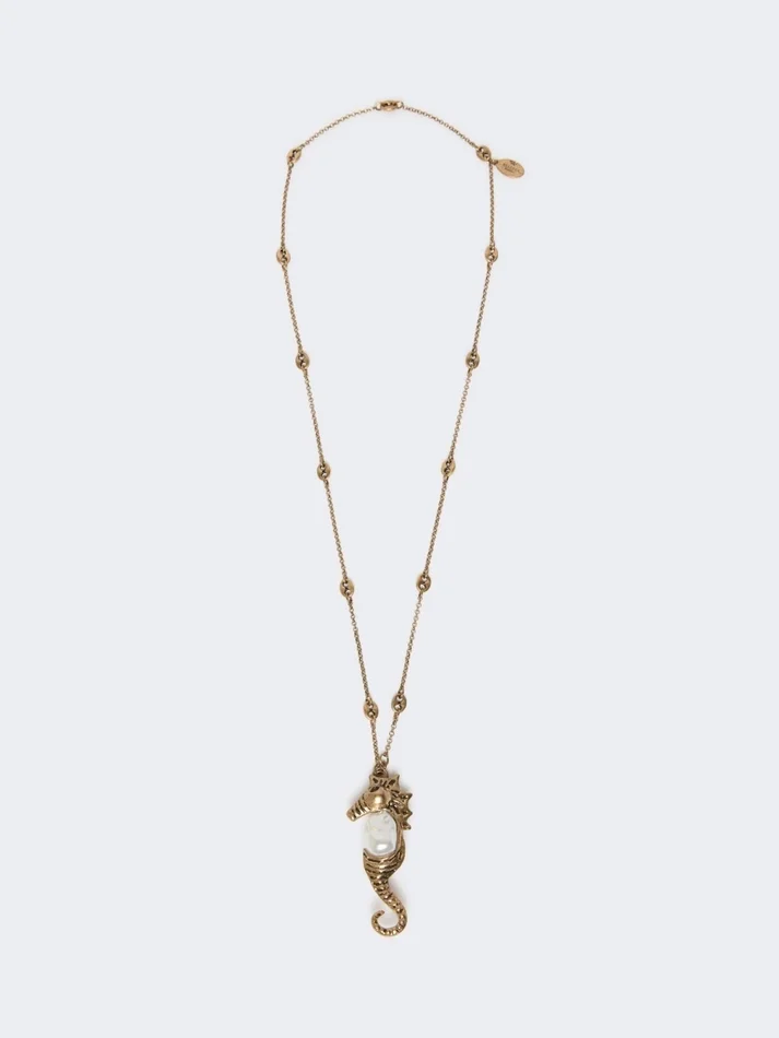 long chain necklace with seahorse pendant that can also be worn as a brooch.