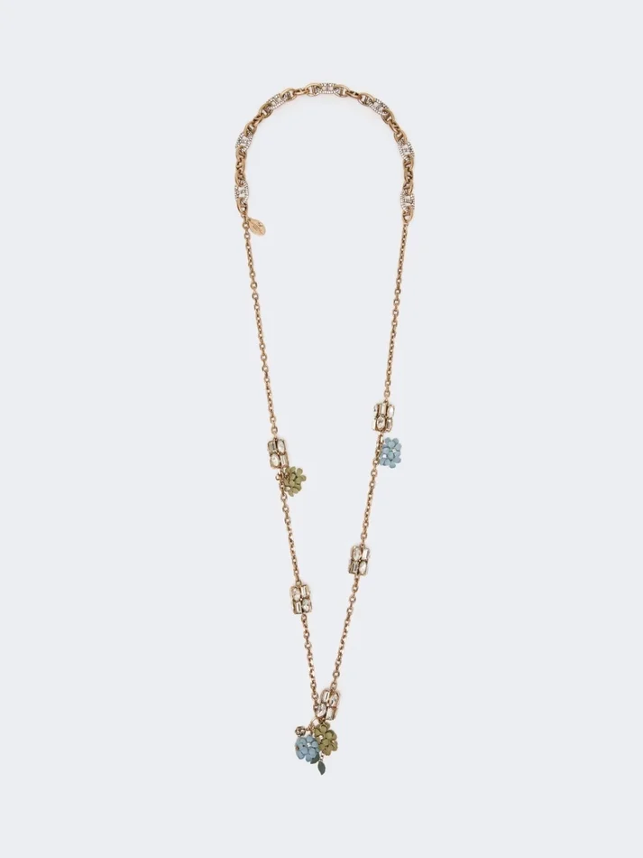 set consisting of a long necklace and drop earrings, with flower-shaped enamel details and baguette crystals in bezels.