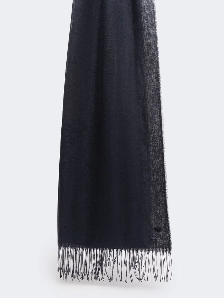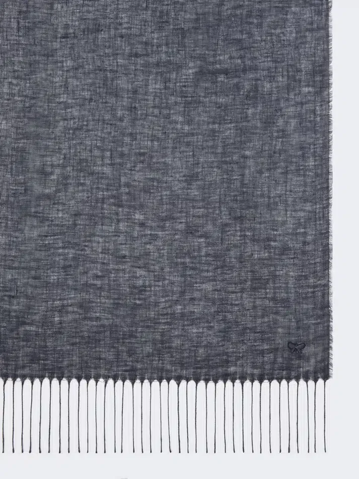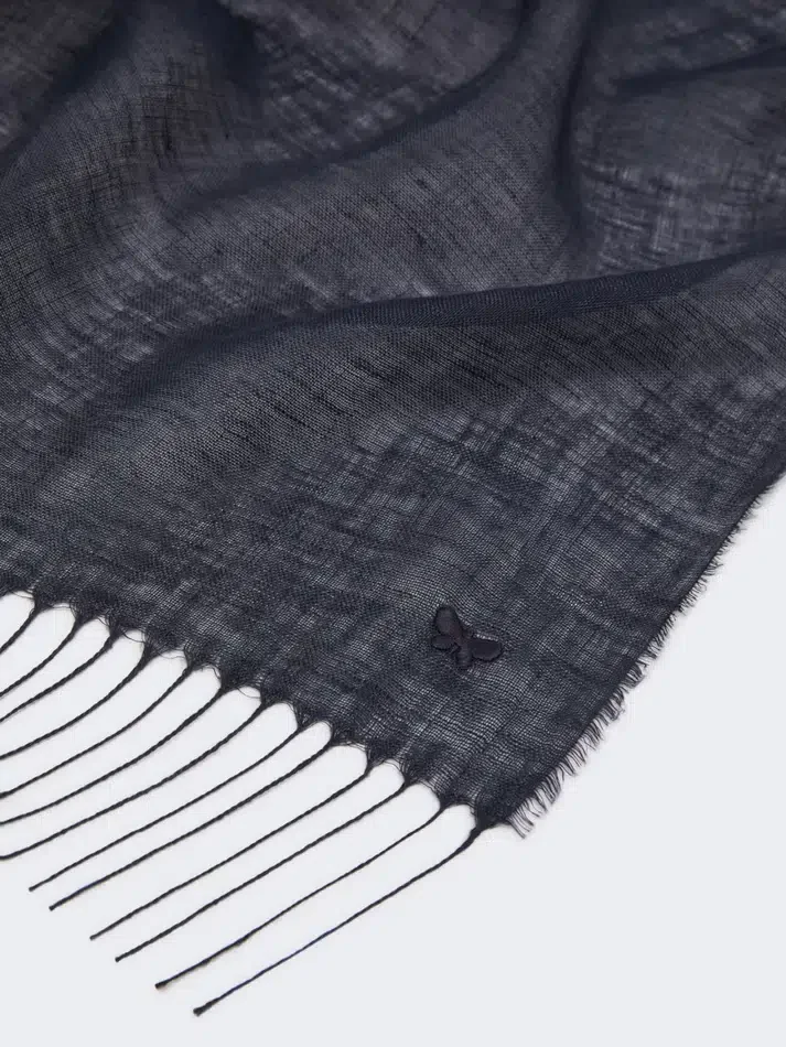 solid colour stole with fringed ends embellished with a matching butterfly logo embroidered on the hem.
