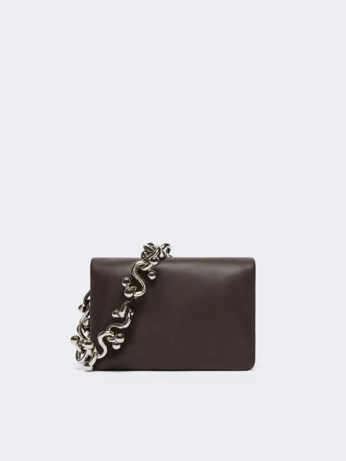 mini envelope bag with flaps made of soft nappa leather and internal padding. the flap closes with a magnetic button. metal chain handle with s-shaped elements and removable leather shoulder strap for adjustable styling.