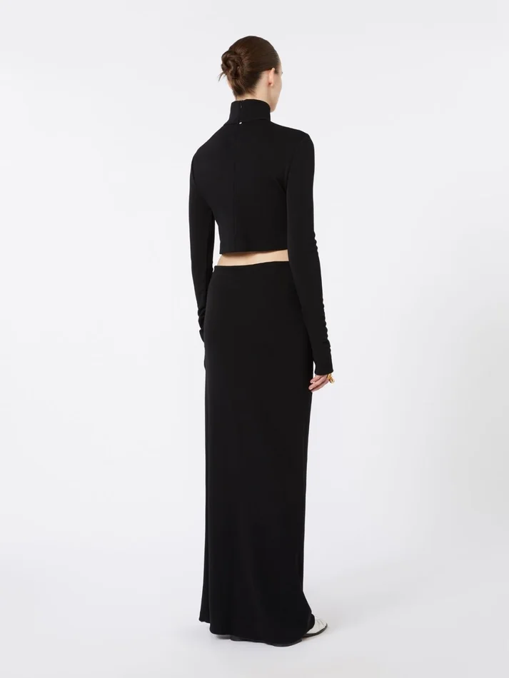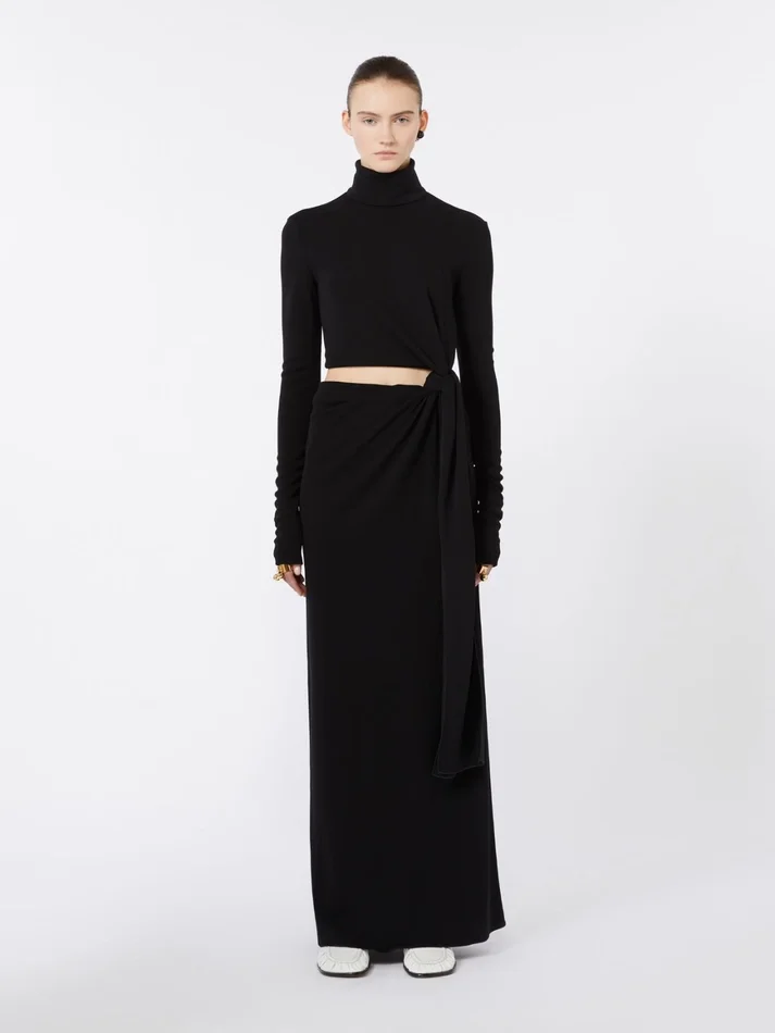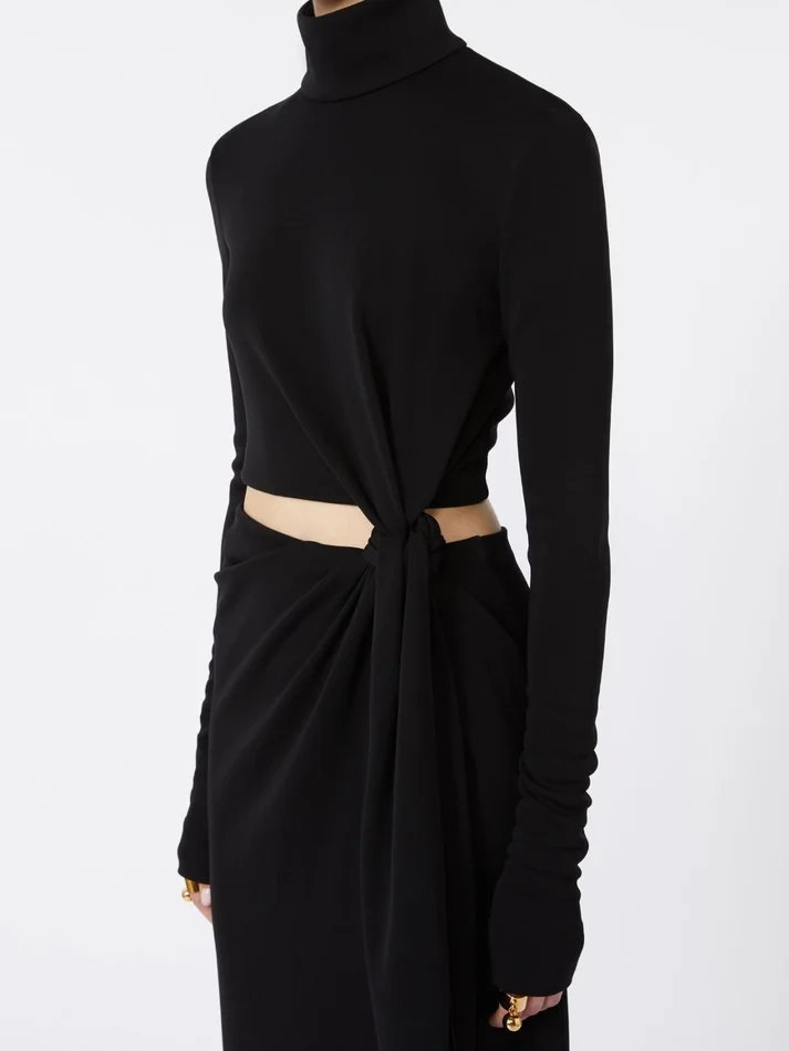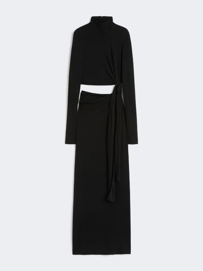 long-sleeved dress with slightly raised neckline. the top and midi skirt are connected by a knot, leaving the waist uncovered.