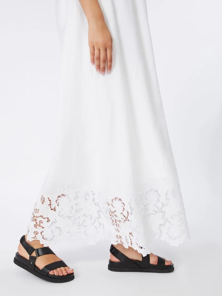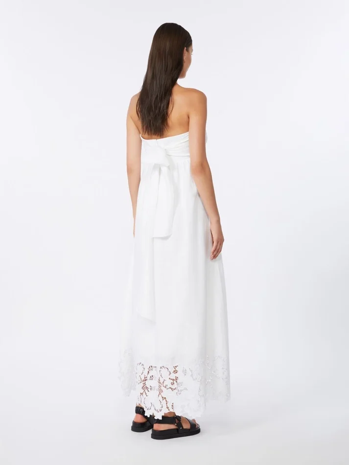 long bustier dress featuring a broderie anglaise-decorated scalloped band at the hem.