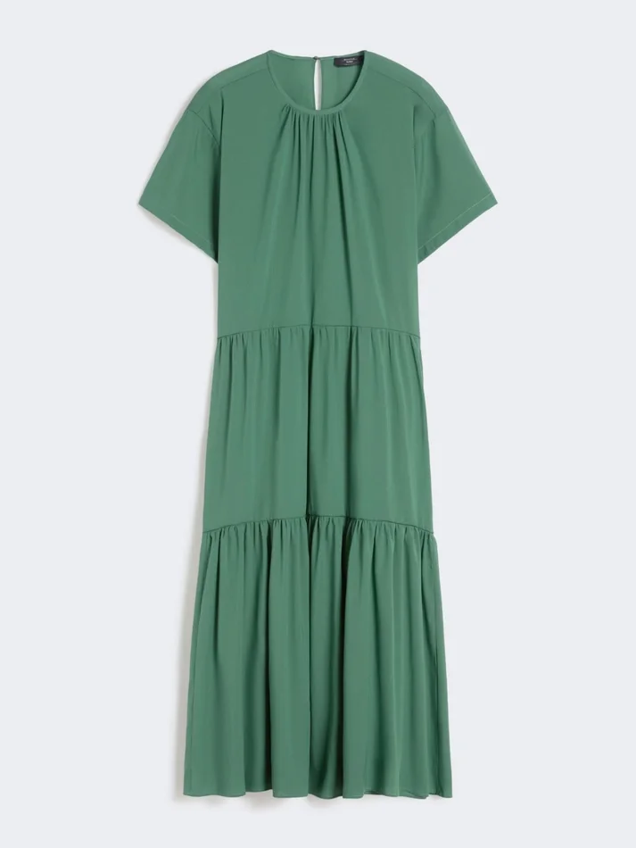 long dress with a loose line, featuring a flounced skirt that gives movement and volume.