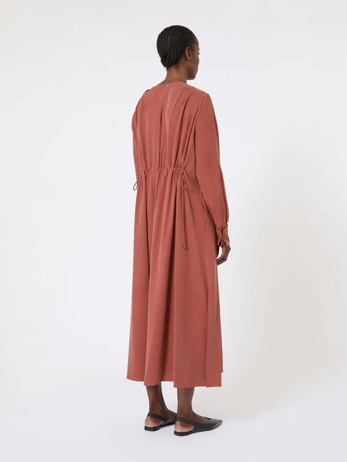 long dress featuring silhouette-accentuating adjustable drawstring detail on the front and back of the waist.