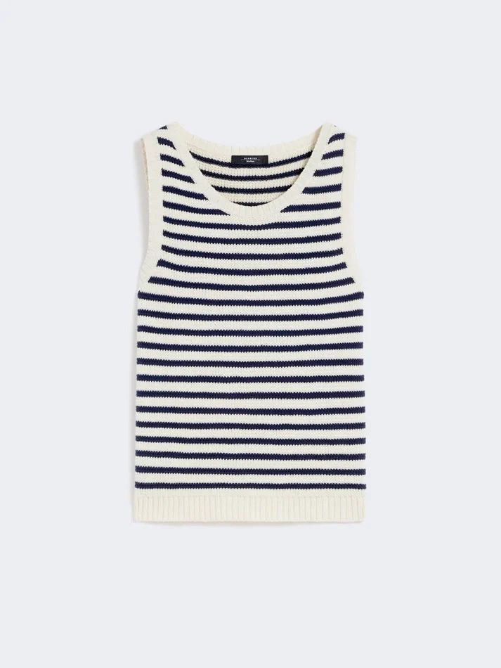 sleeveless sweater with a relaxed fit, featuring a moss stitch.