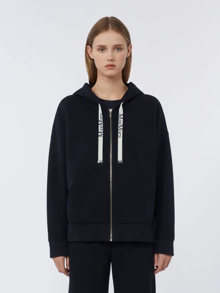 drawstring-hood sweatshirt with branded jacquard ribbons.