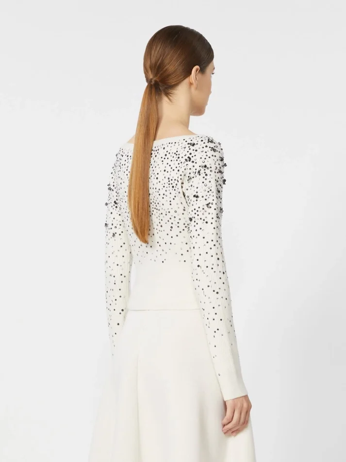 feminine sweater featuring hand-embroidered wet-look sequin detail.