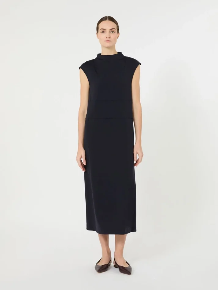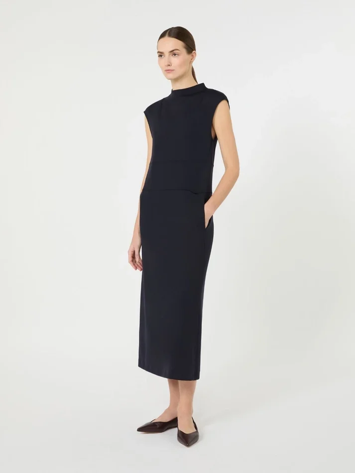 sleeveless midi dress with a characteristic fitted sheath silhouette, slightly flared at the hem.