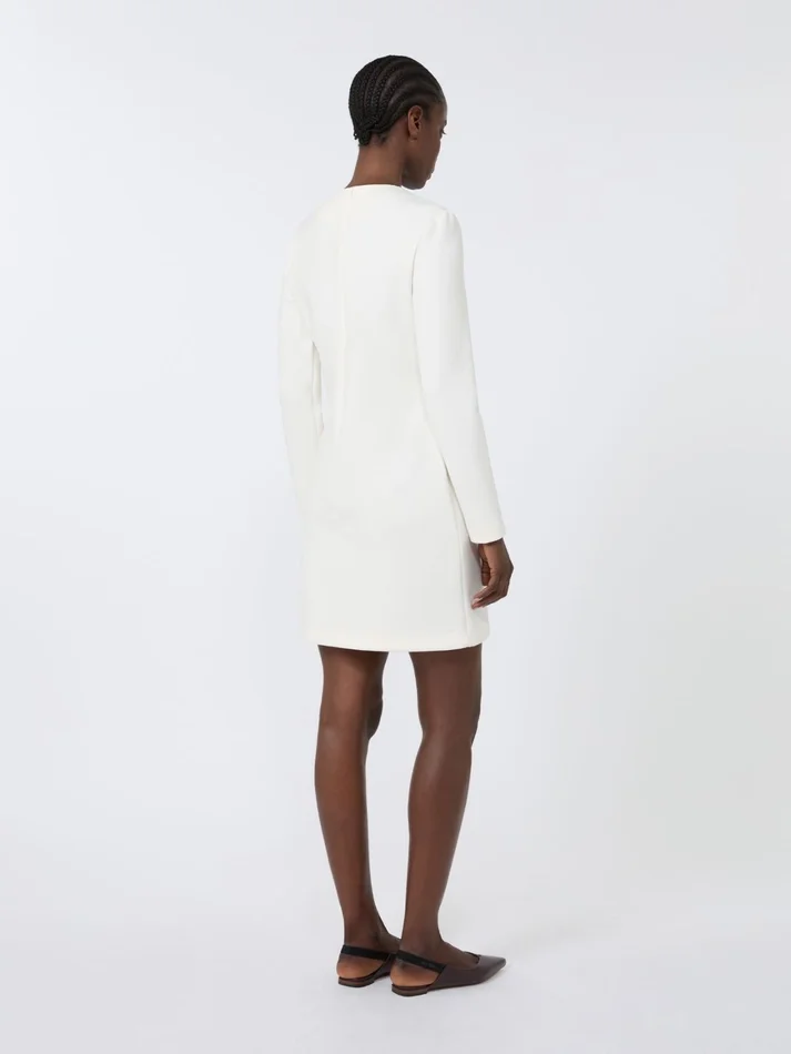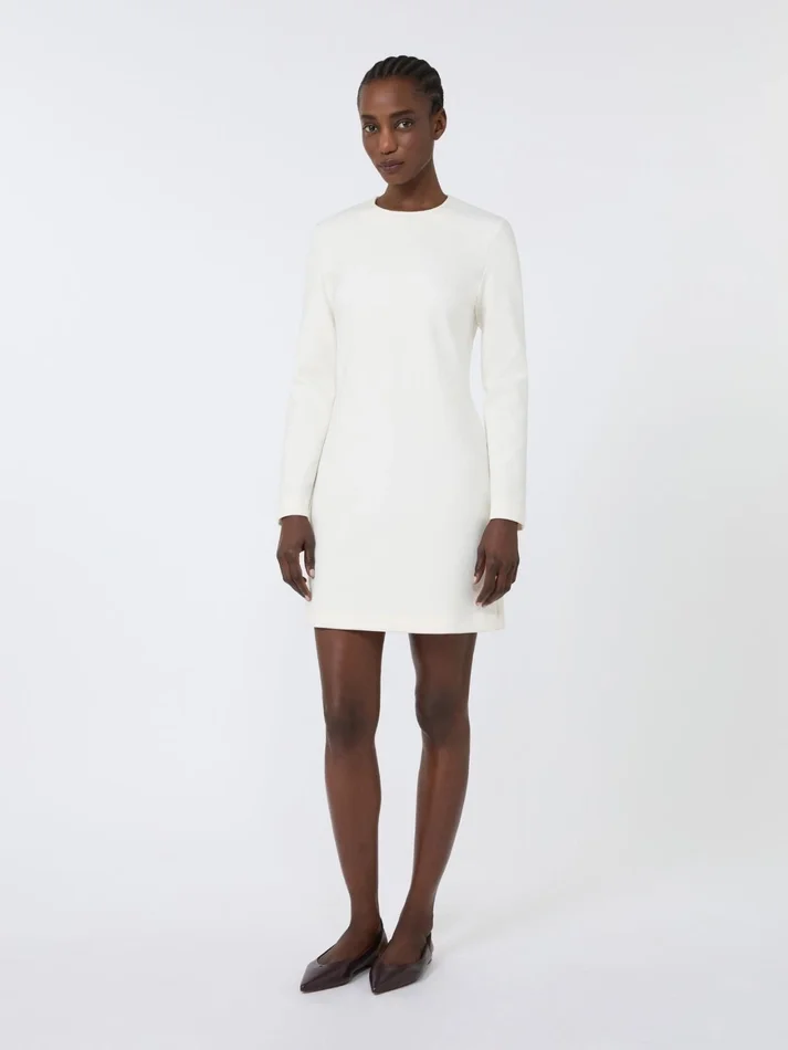 short dress with a fitted silhouette, defined by darts on the bodice and hand-sewn pick stitch.