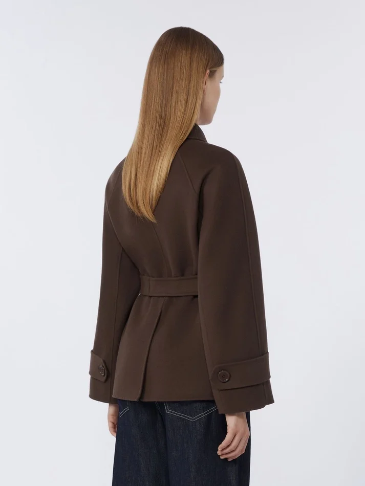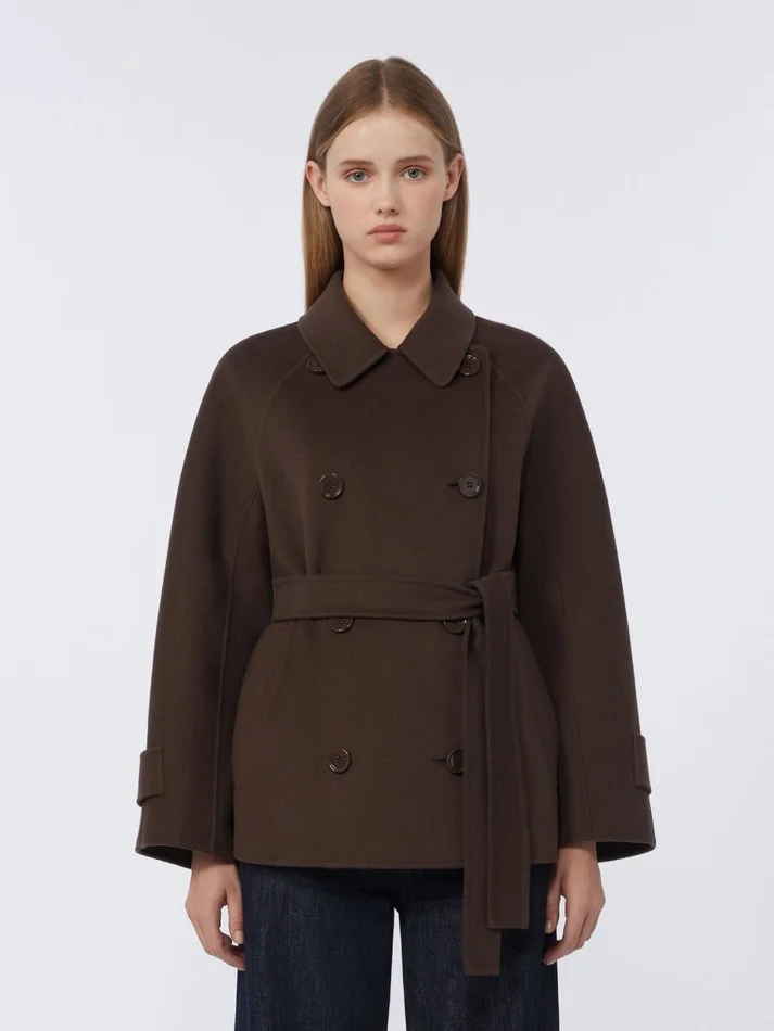 short double-breasted coat featuring iconic trench coat-style details and a matching belt at the waist.