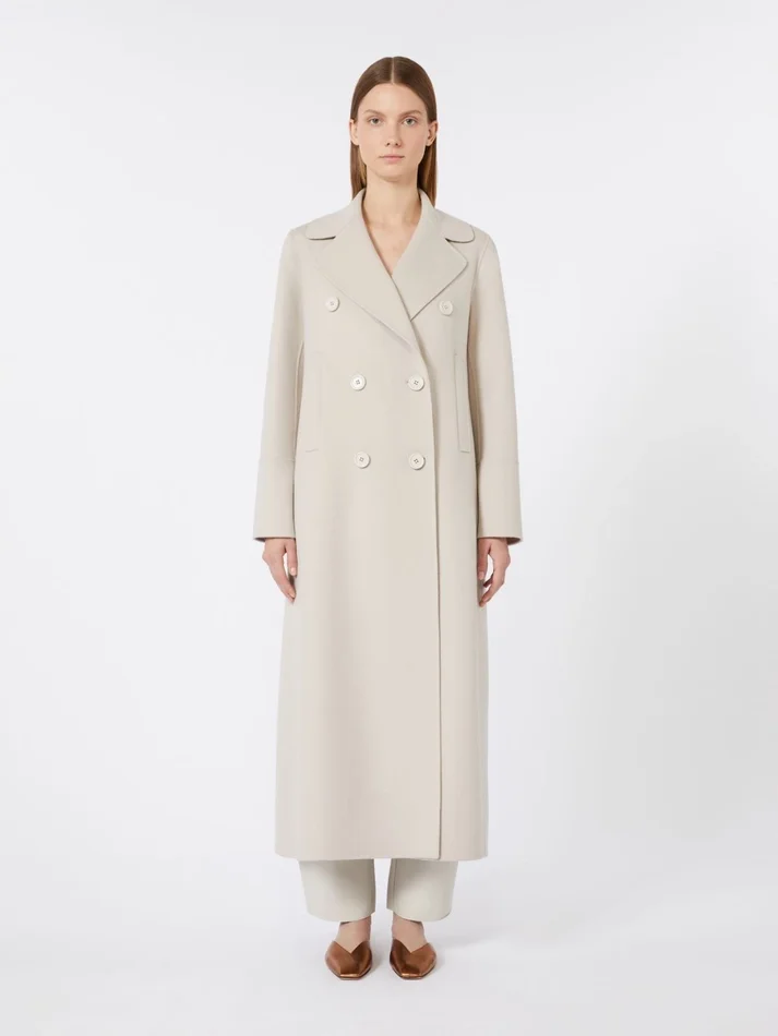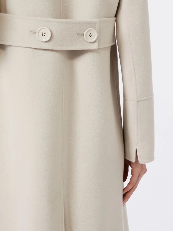 long double-breasted coat featuring button-adjustable half-belt detail at the back of the waist.