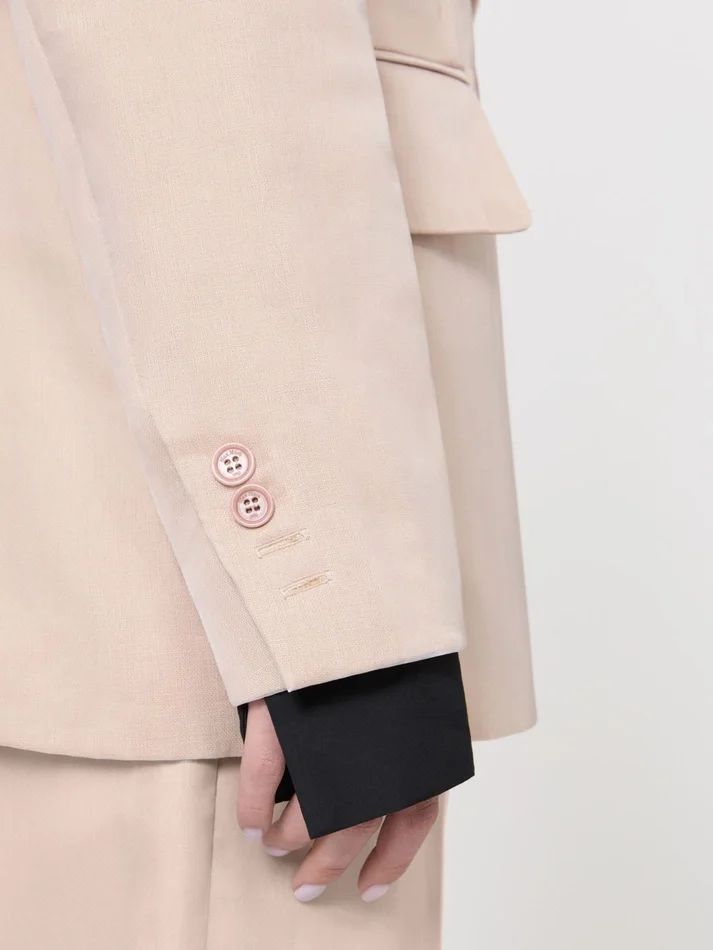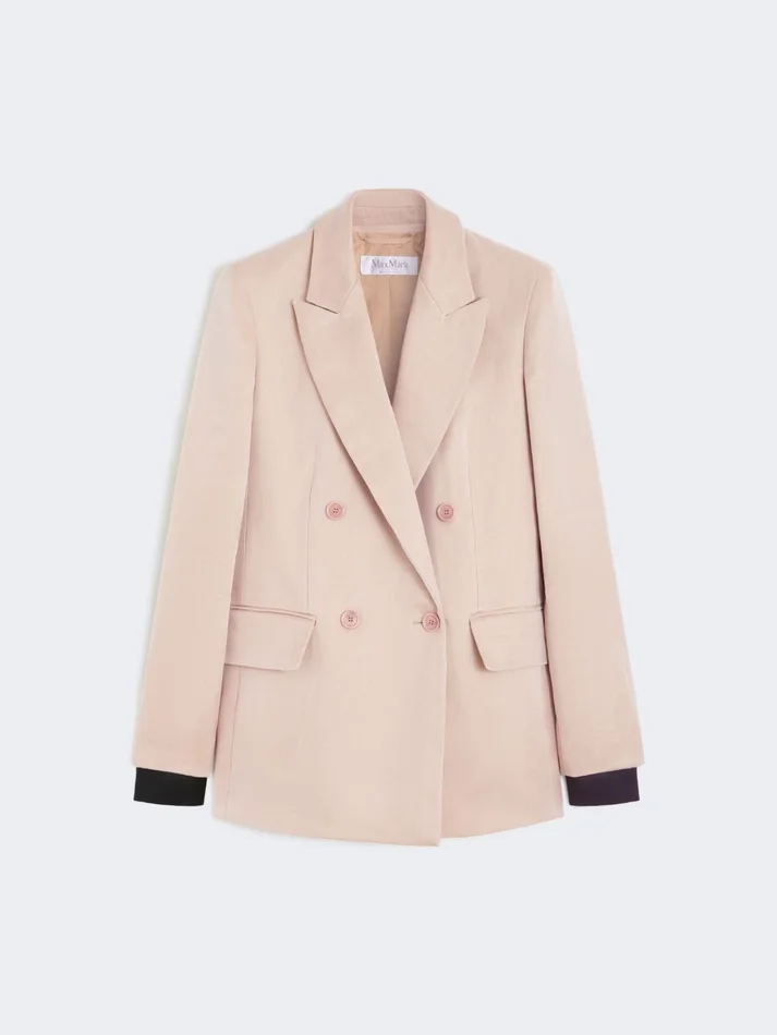 double-breasted blazer with a wide silhouette, externally lined in contrasting pure silk organza.