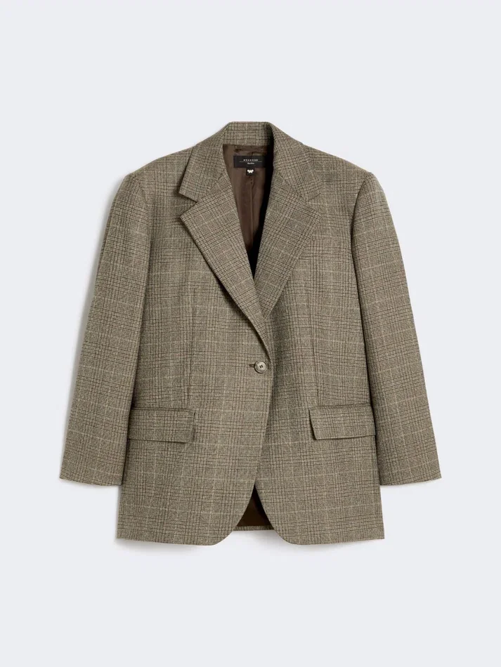 single-breasted mannish-style blazer featuring a classic glen plaid pattern.