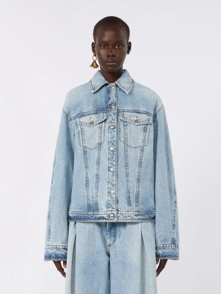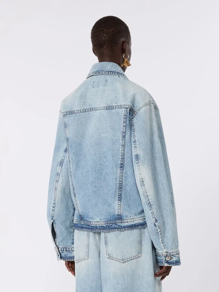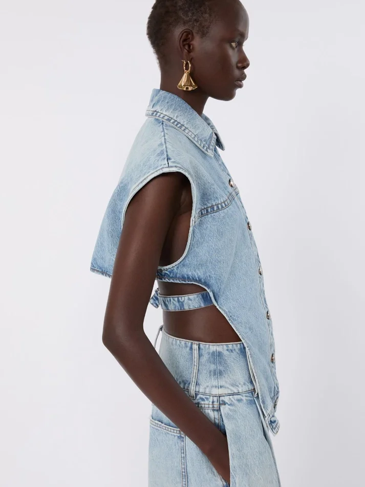 denim jacket with double-layer construction connected with a button on the neck. inside is a sleeveless vest with shirt collar and adjustable back strap. on the outside, a jacket with long sleeves, seams on the body and patch pockets.