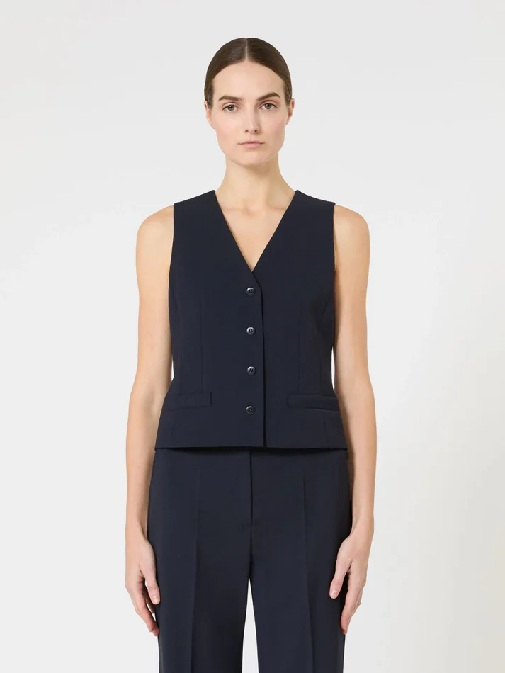 vest with a feminine silhouette, slightly fitted at the waist and with a small central slit on the back.