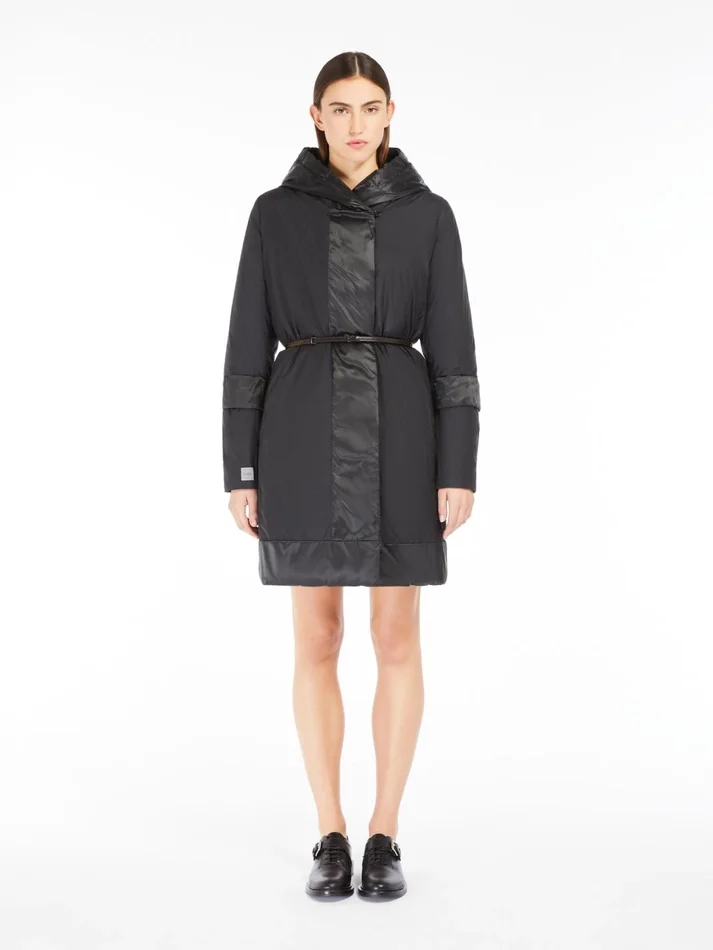 reversible midi down jacket with hood. supplied with two belts: one in a matching fabric, the other in technical webbing and leather.