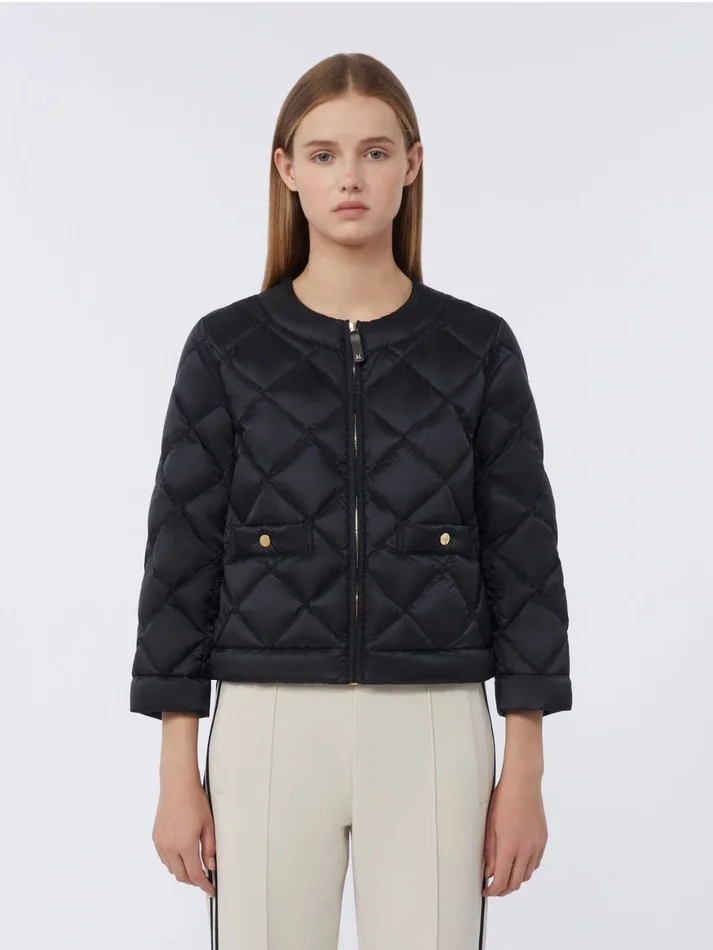 short crew-neck jacket padded with goose down, finished with elastic trim.