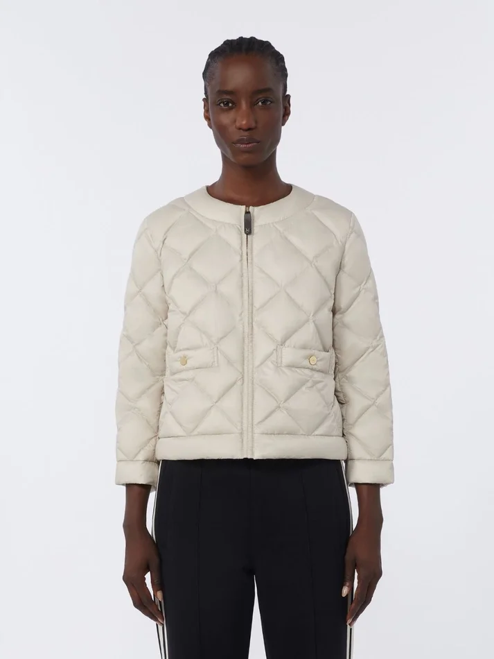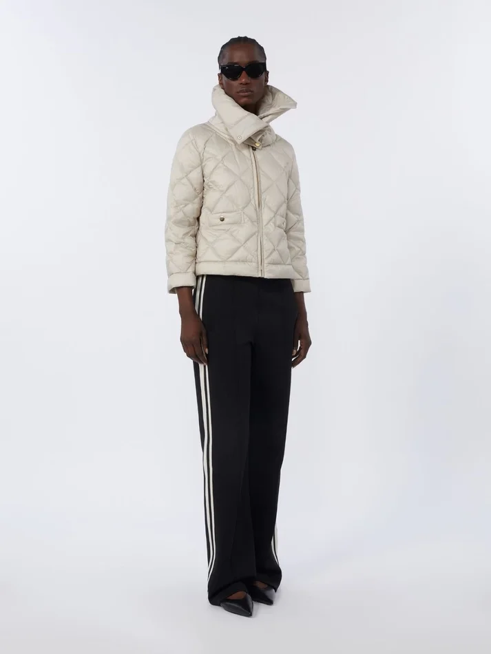 short crew-neck jacket padded with goose down, finished with elastic trim.