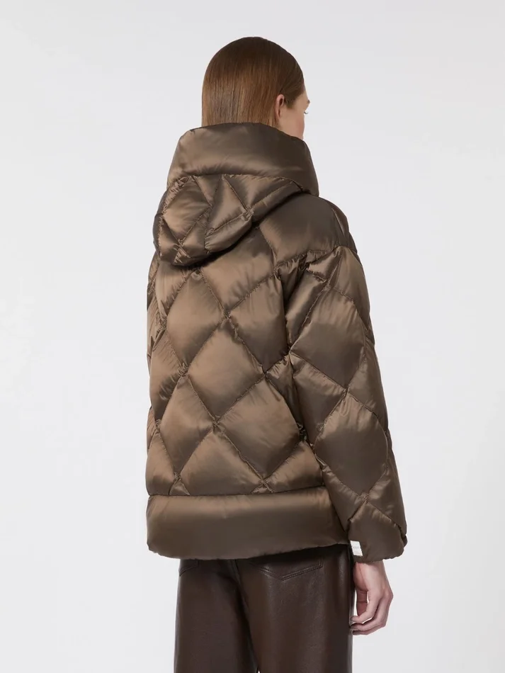 short down jacket with horizontal-striped quilting on the front bodice and diamond pattern on the back, hood and sleeves.