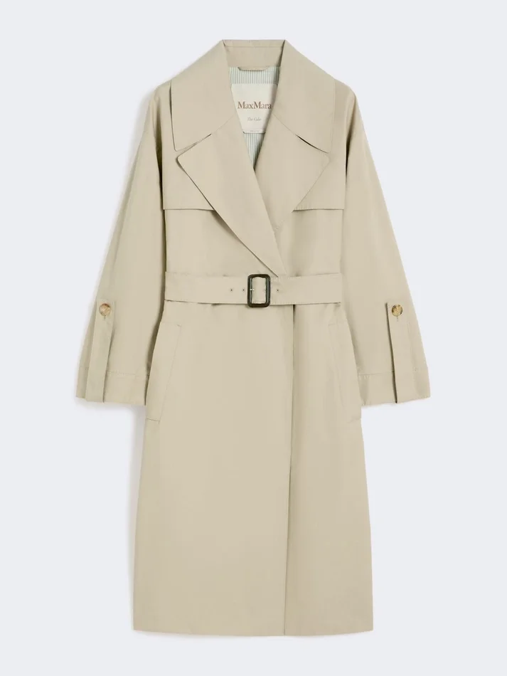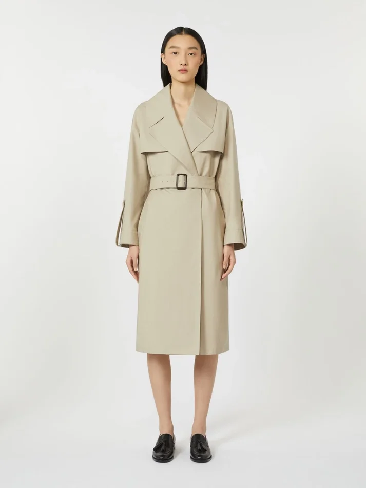 midi-length double-breasted trench coat with two detached yokes on the front, tailored stitching and welt side pockets.