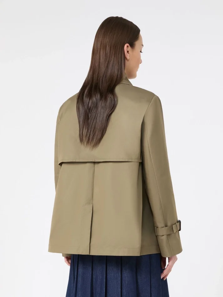 short, double-breasted trench coat distinguished by the front storm flap and cuff straps.