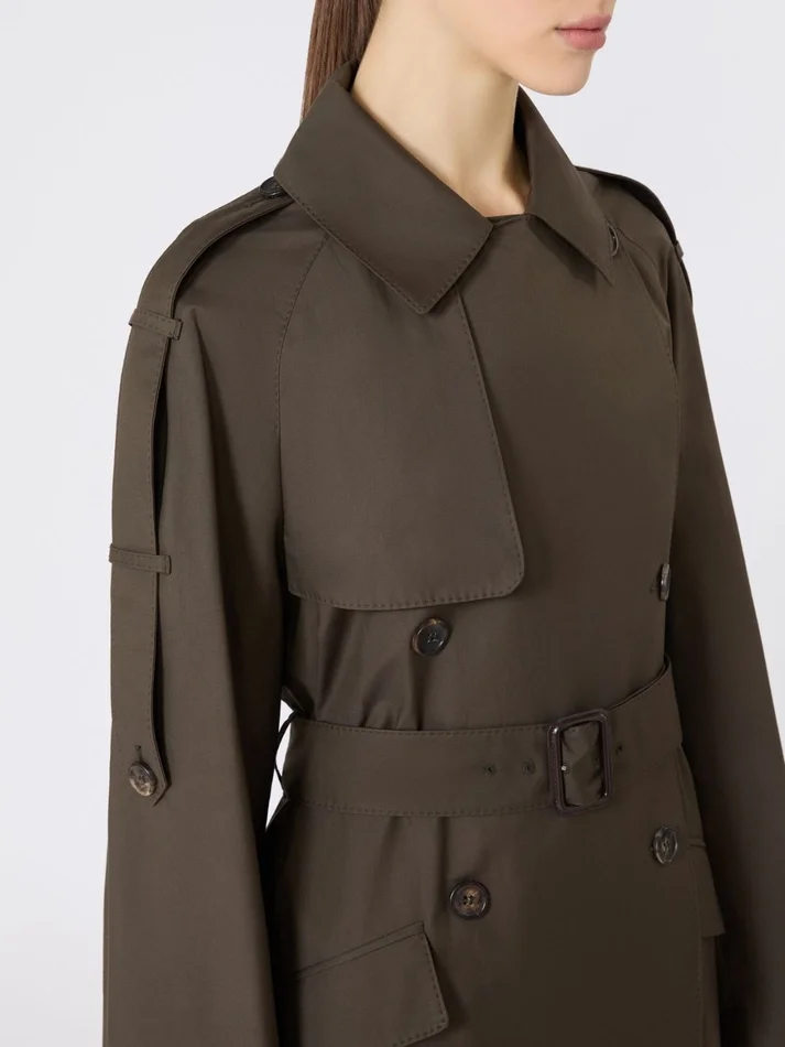 long double-breasted trench coat with tailored stitching, detached yoke and matching belt with embossed logo and leather buckle.