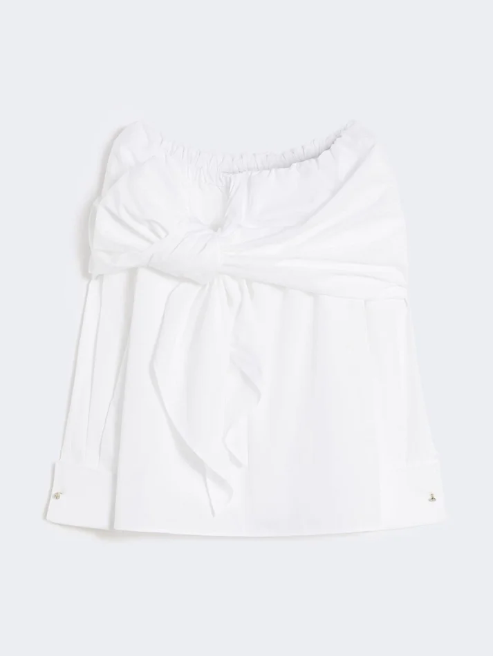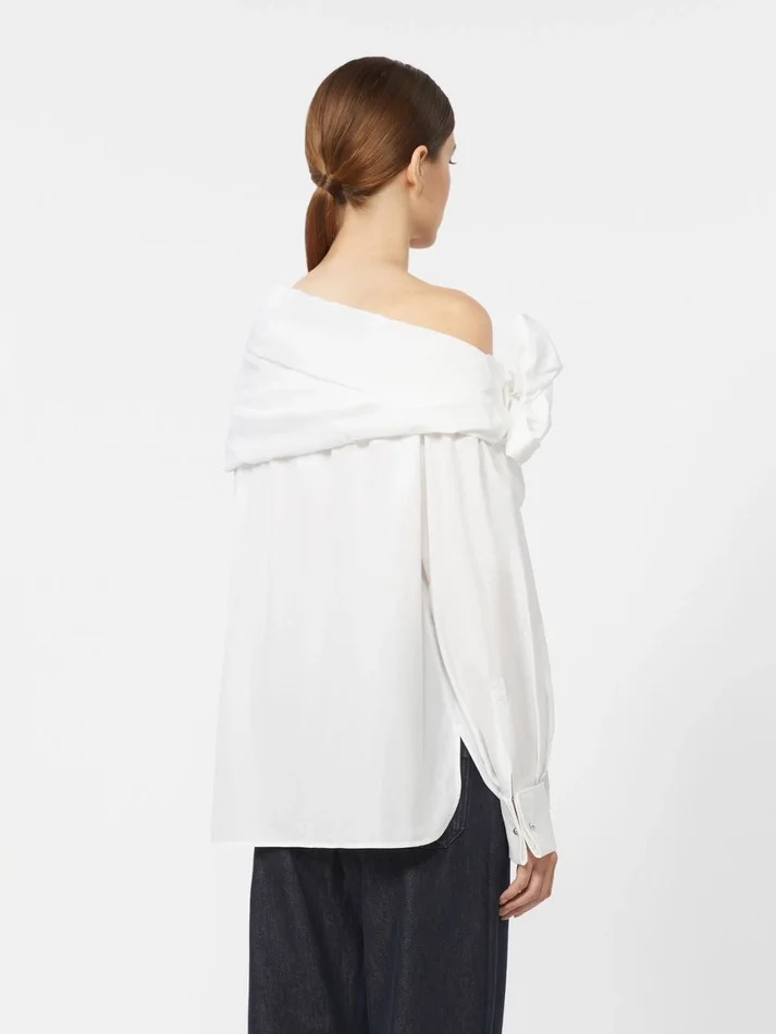 blouse with asymmetrical neckline and fabric stole that wraps around the shoulders and ties in a bow at the front.