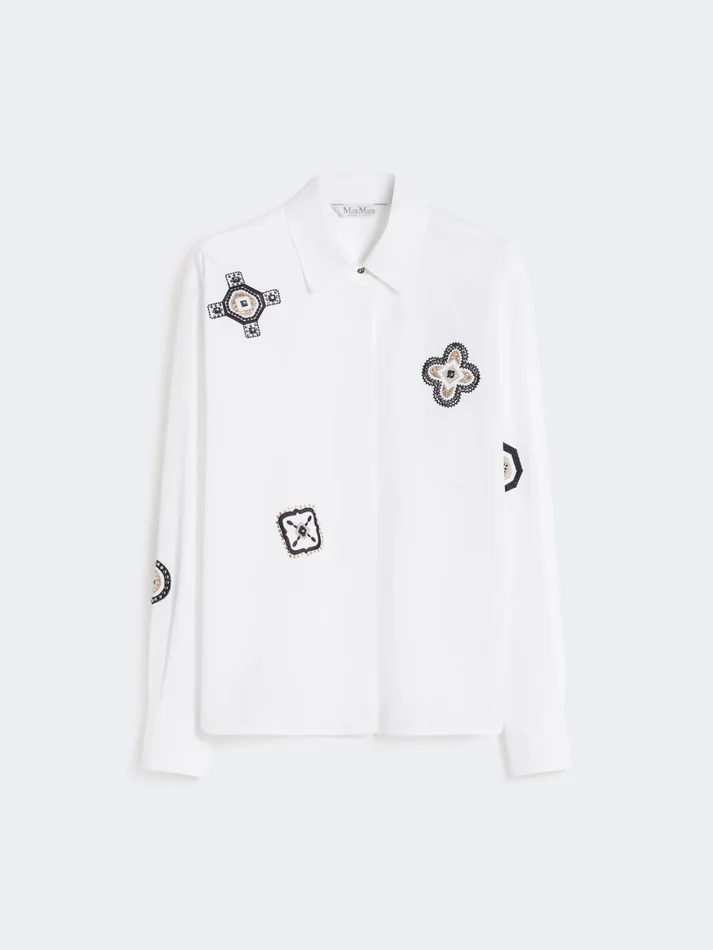 mannish shirt embellished with placed embroidery on the front and sleeves.