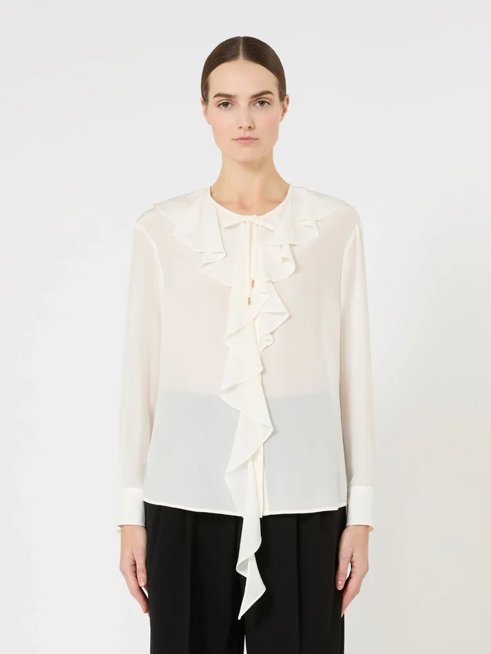 feminine blouse featuring ruffle detail on the neck and front.