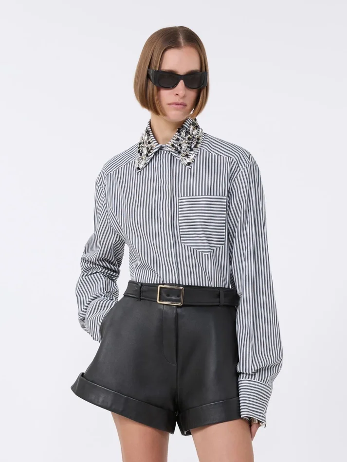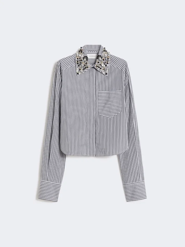 striped pure cotton poplin cropped shirt with straight fit, and chest pocket. hidden button placket for a streamlined look.