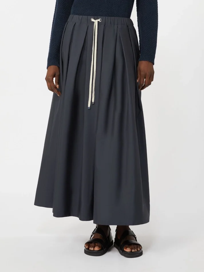 long, a-line skirt with a full volume, elasticated waist and pleated pattern.