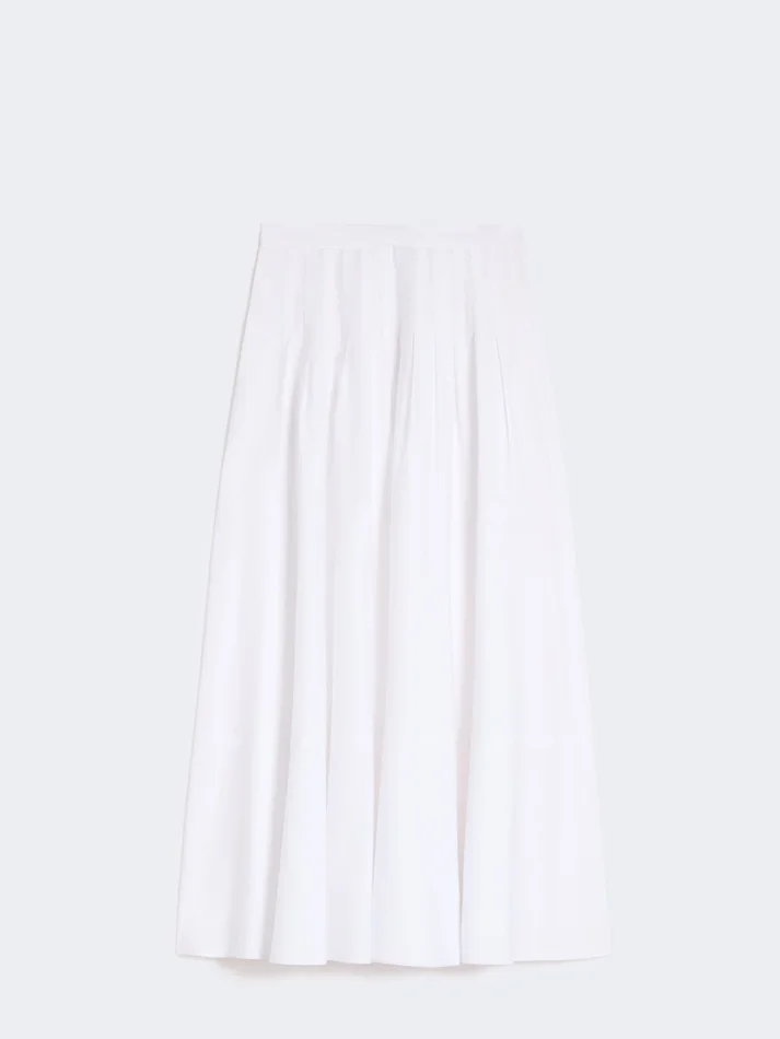 long skirt, featuring a corset motif at the waist and soft pleats.