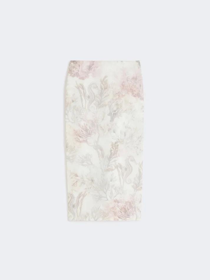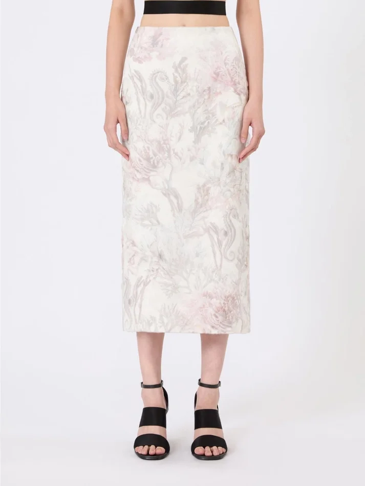 midi skirt with a pencil silhouette, layered externally with printed pure silk organza.