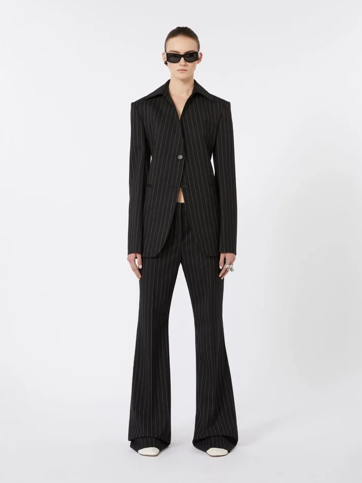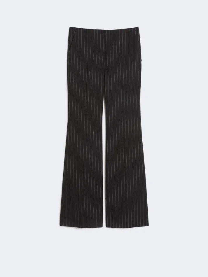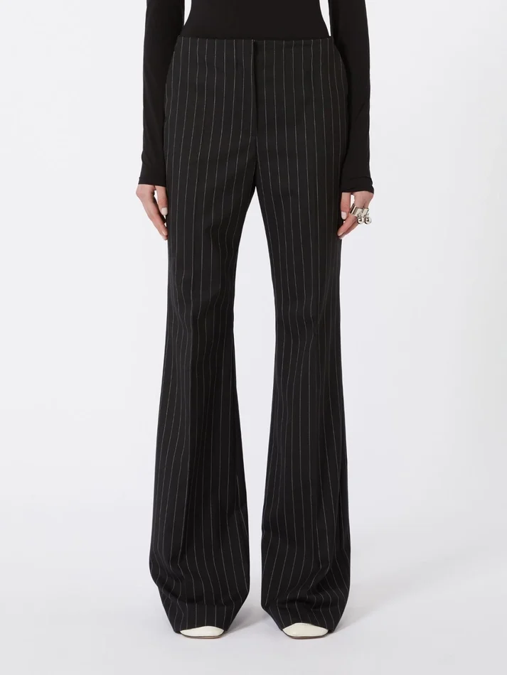 flared line and low waist define these stretch wool gabardine trousers with a pinstripe pattern. the pressed crease visually elongates the silhouette.