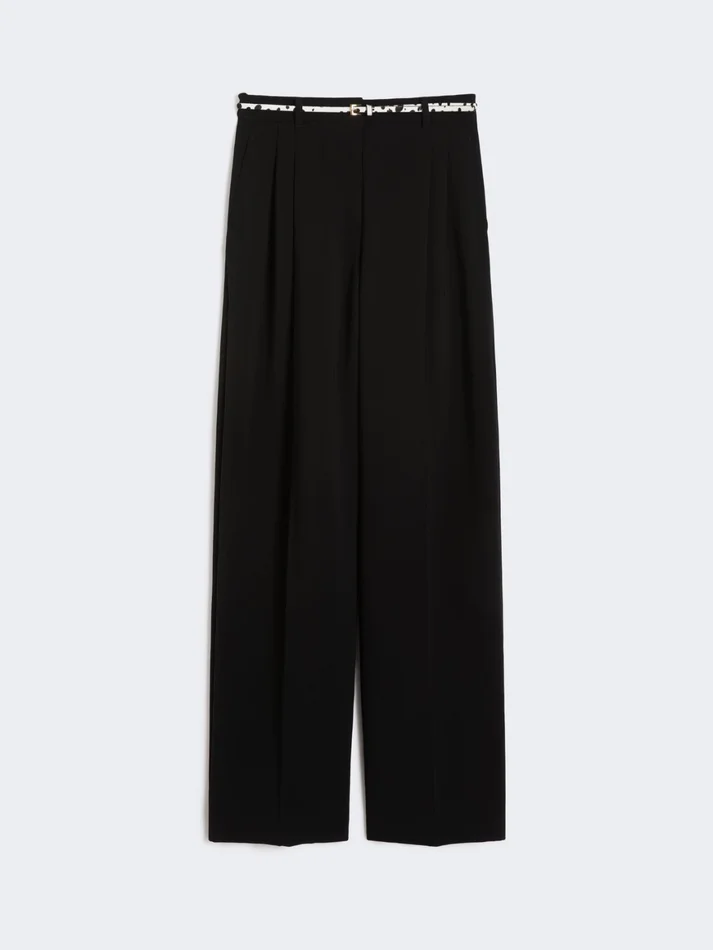 high-waisted trousers, characterised by a fluid silhouette with double pleats on the front, one of which is shaded.