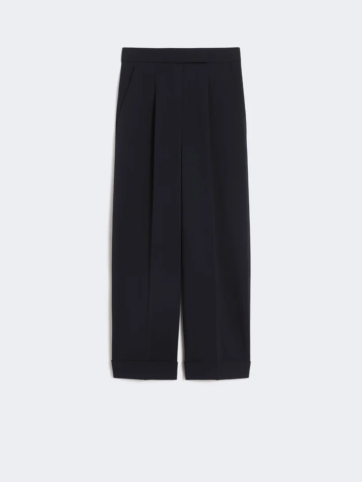 high-waisted trousers with turned-up hem, cropped above the ankle.