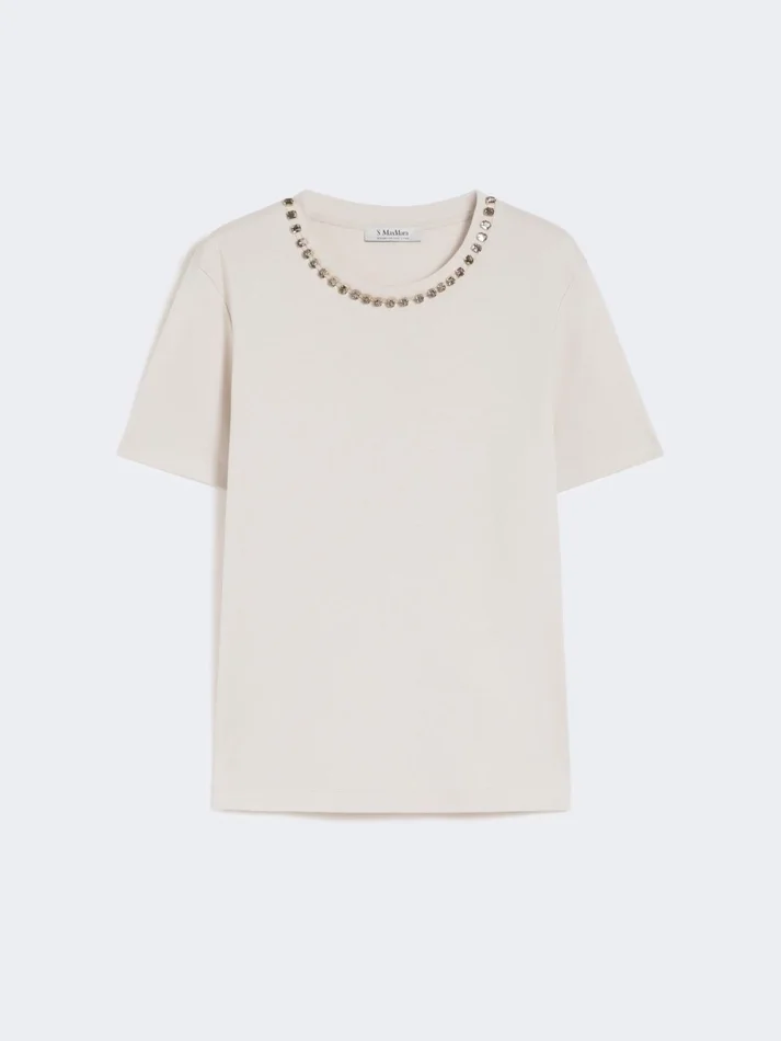 basic t-shirt featuring bejewelled chaton embroidery on the neckline.