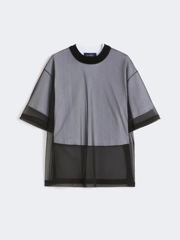 double-layer t-shirt, with pure cotton inner layer and cropped waist. the outer part has extra volume and is made of contrasting-colour tulle.