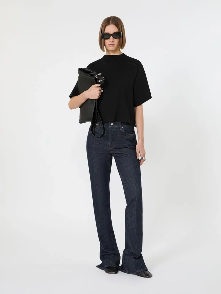 a contemporary evolution of the boxy t-shirt, designed with an original crater neck emphasised by the ribbed insert. the fit is straight over the torso with small on-tone logo printed on the left shoulder.