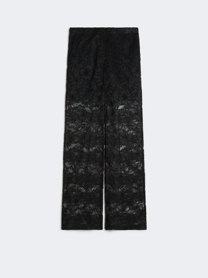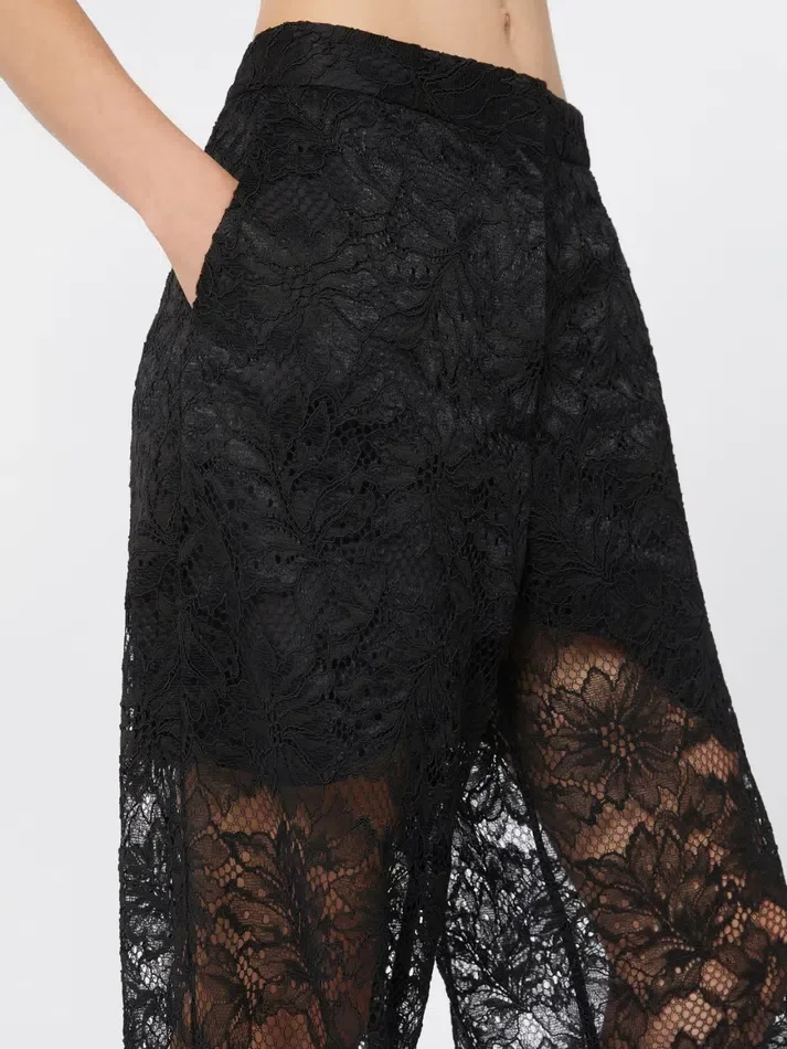 lace trousers with a rebroda floral pattern. the model boasts a straight leg, slim-cut waist, mannish-style pockets and a branded internal waistband. style lined to below the hips.