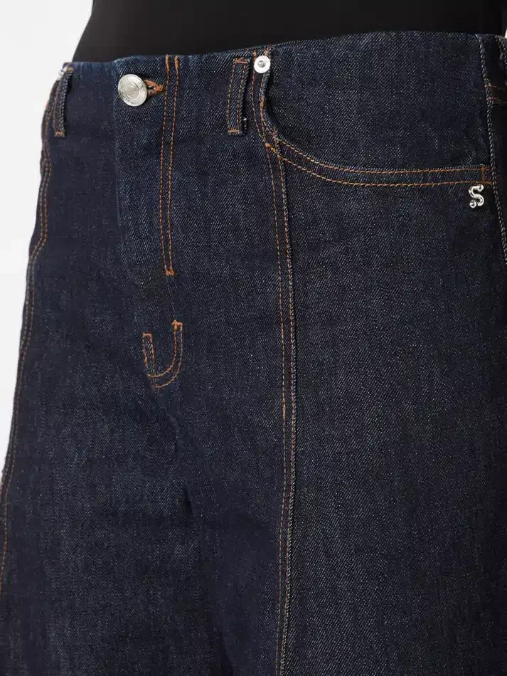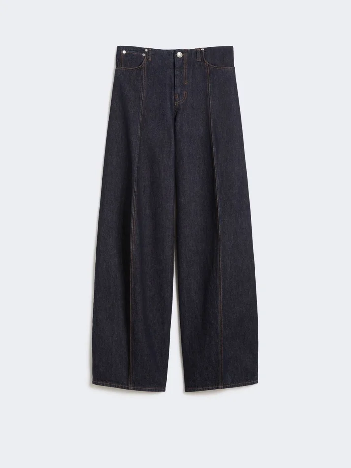 new five-pocket jeans with an innovative shape, with a rounded line at the knee and loose fit. the construction without a waistband emphasises the clean look of the trousers..