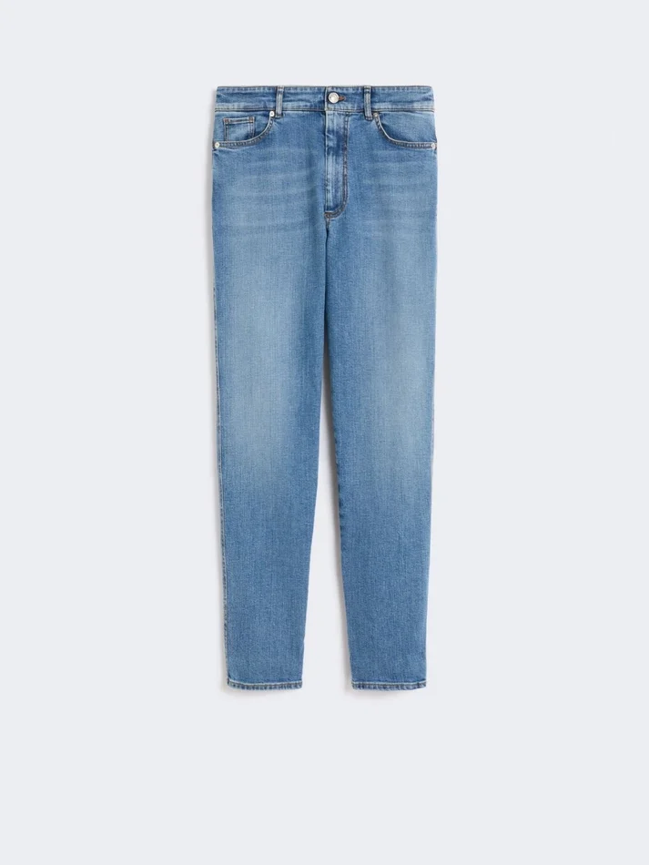 - authentic indigo stretch denim jeans with medium vintage and dark used garment treatment