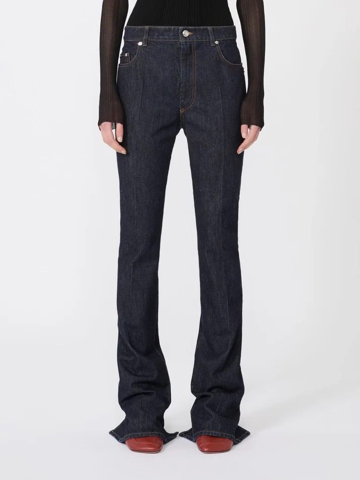 slim-fit jeans with a flared hem and small slit for the perfect flare line. the pressed crease along the leg further elongates the silhouette.