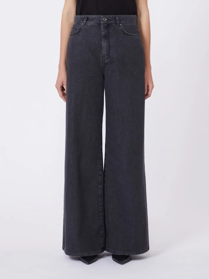 five-pocket jeans with a wide-leg silhouette, customised with a butterfly logo label on the right back pocket.