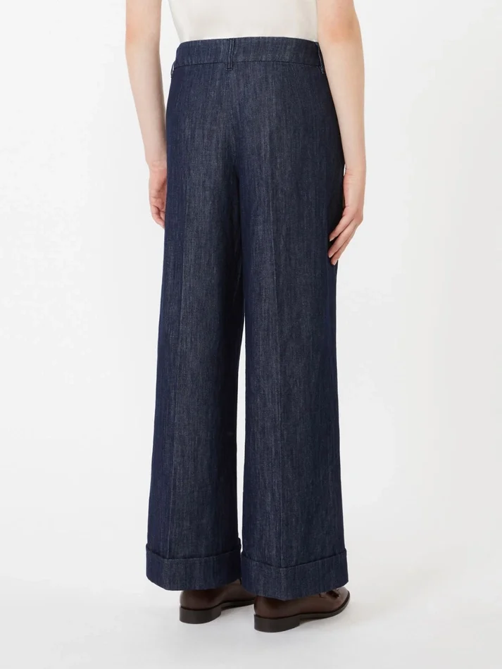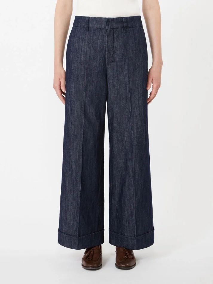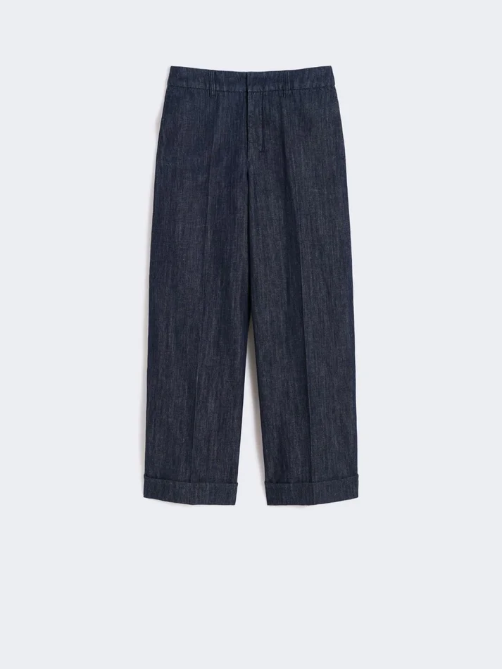 - trousers in garment-dyed cotton and linen denim