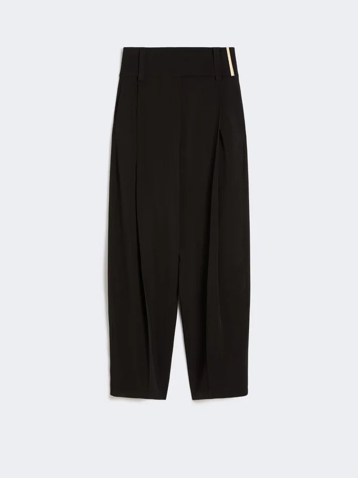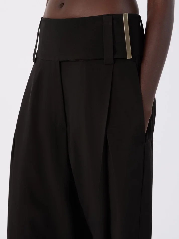 low-rise trousers featuring a statement belt decorated with a metal clip at the side. the wide, pleated leg tapers slightly at the hem.