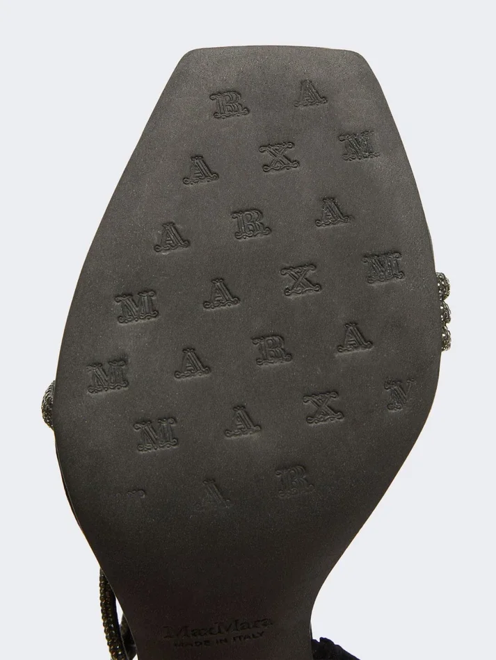 square-toed sandals featuring thin straps embellished with micro glass crystals that illuminate and wrap around the foot.